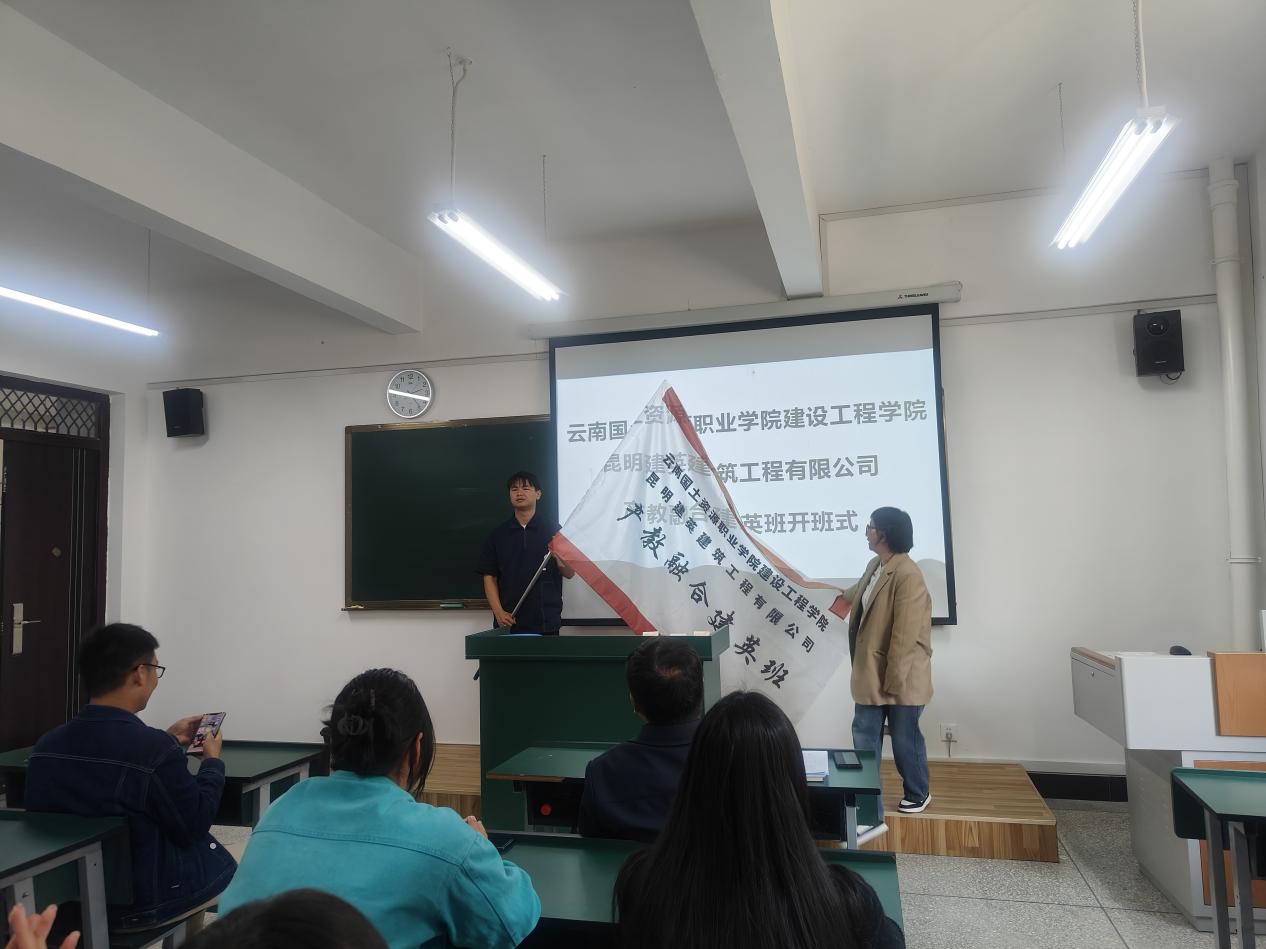 昆明建英工程有限公司总经理陈艳为“建英班”授班旗。
