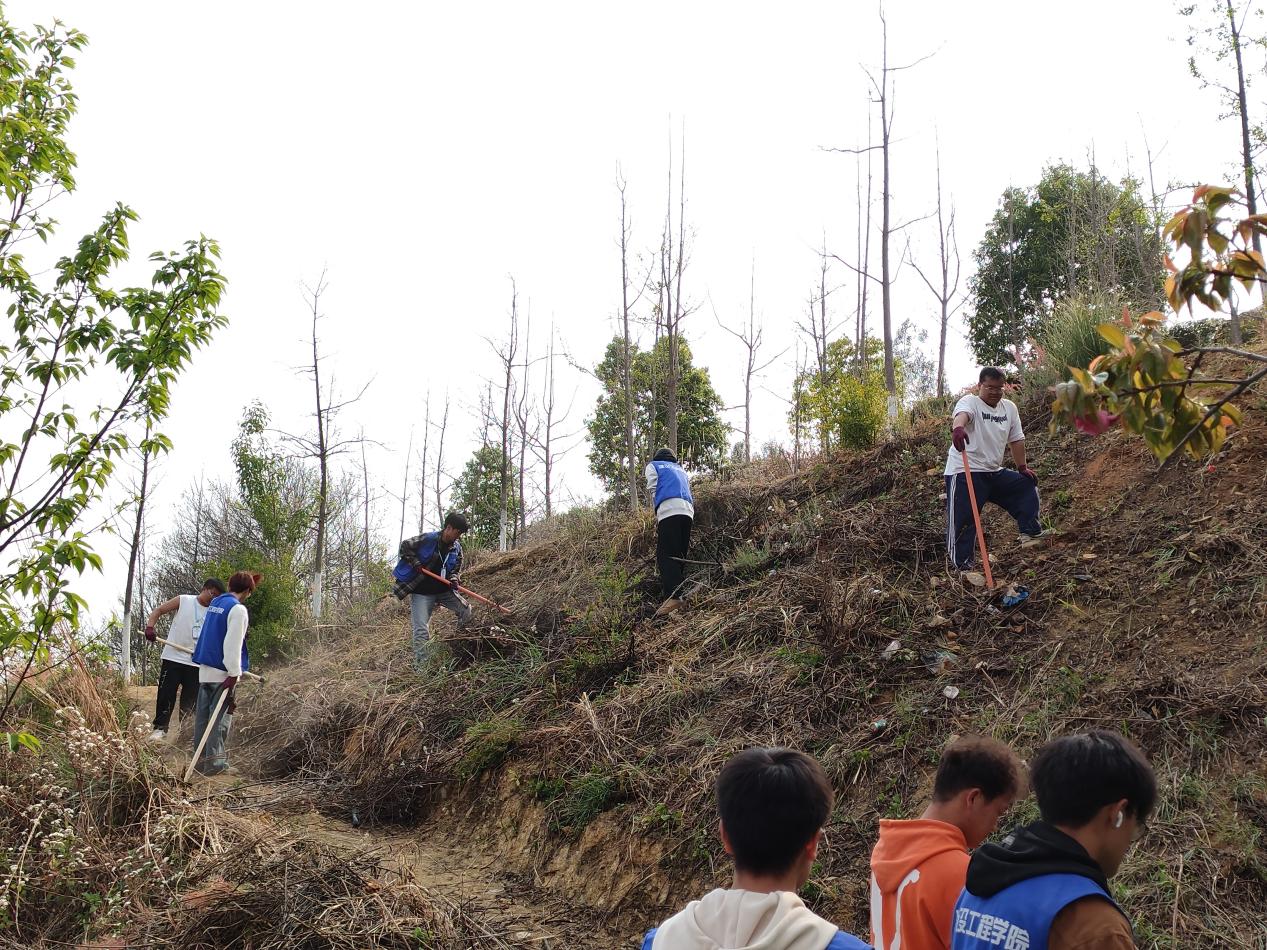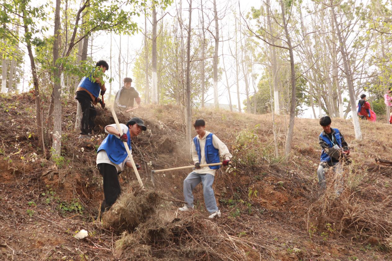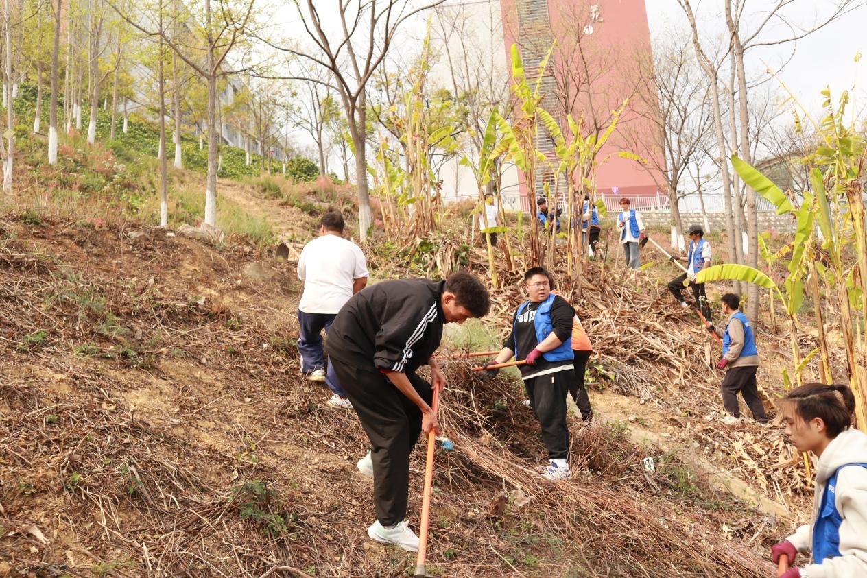 同学们带着锄头、扫帚等清洁工具兴高采烈地进行劳动,积极参与到现场的清洁行动中,这边同学负责铲除杂草,那边的同学捡垃圾,大家分工合作,场面繁忙有序。
