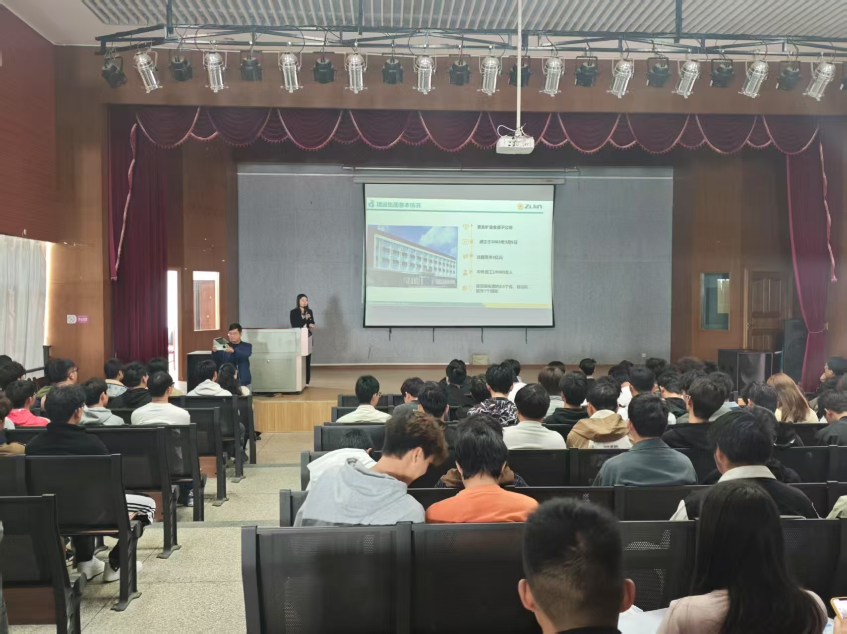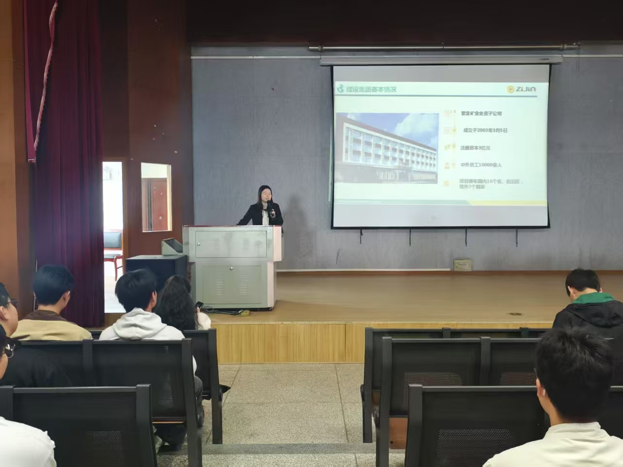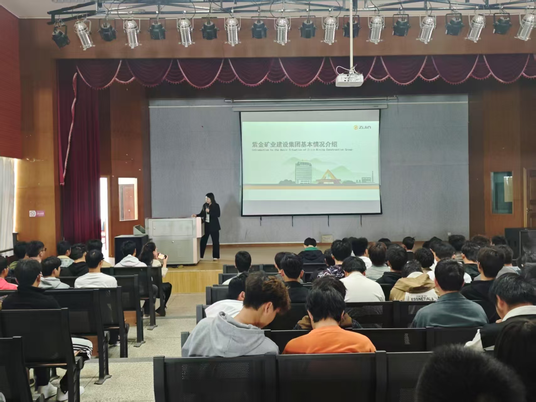 宣讲会上,紫金矿业建设集团有限公司的企业负责人通过播放企业宣传片及展示PPT的方式,向同学们详细介绍了公司的发展历程、企业文化、组织架构、企业规模、取得的成果与先进设施、业务范围以及人才培养体系,使同学们能够直观感受企业的深厚底蕴与强大实力。