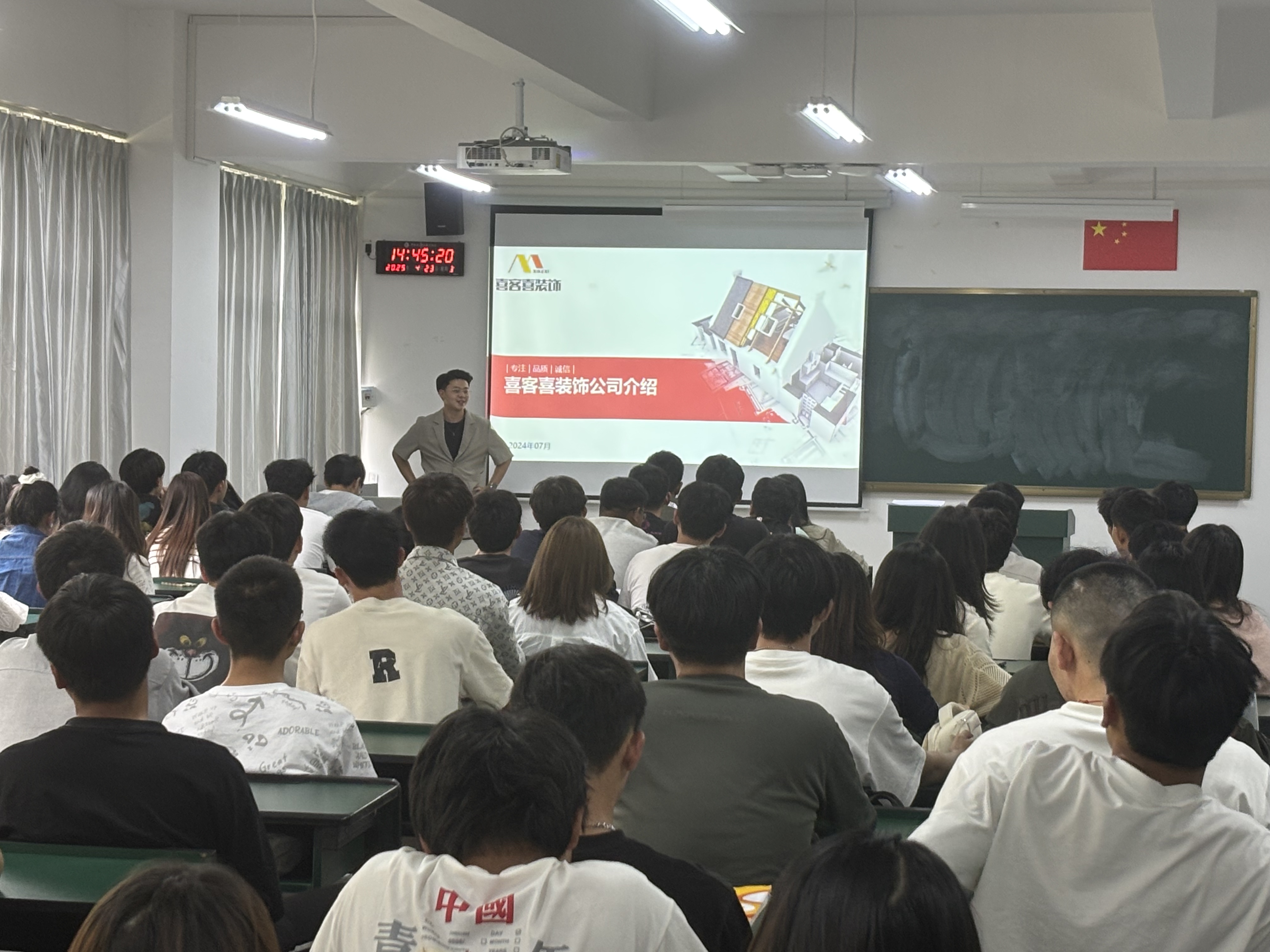 宣讲会伊始,朱磊老师作动员讲话。他向同学们详细介绍了喜客喜装饰公司在行业内的竞争优势,指出该公司凭借创新的设计理念与精湛的施工工艺,已成功打造众多优质家装、工装项目,在业内树立了良好口碑。朱老师鼓励同学们把握此次难得的就业机会,积极投递简历。