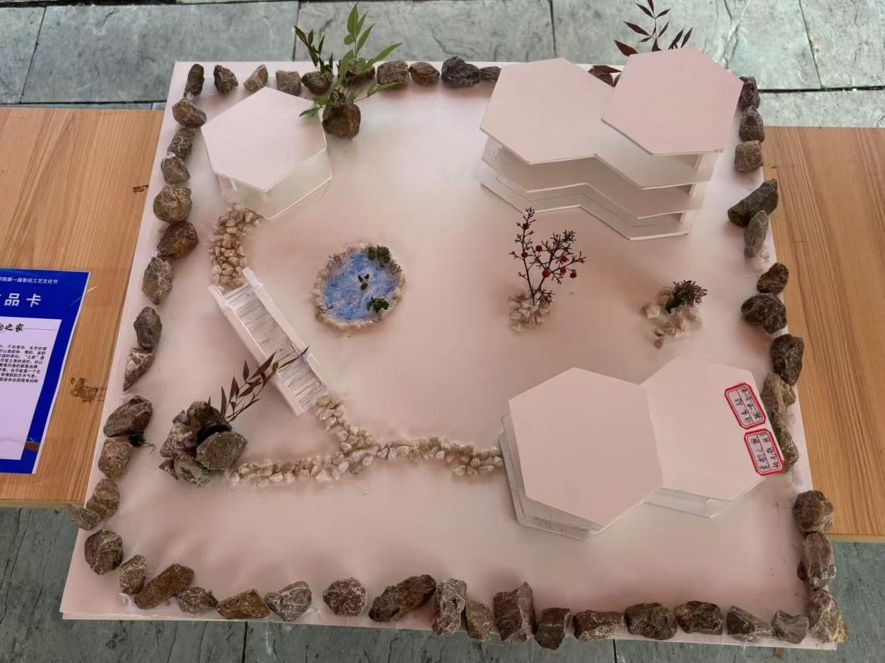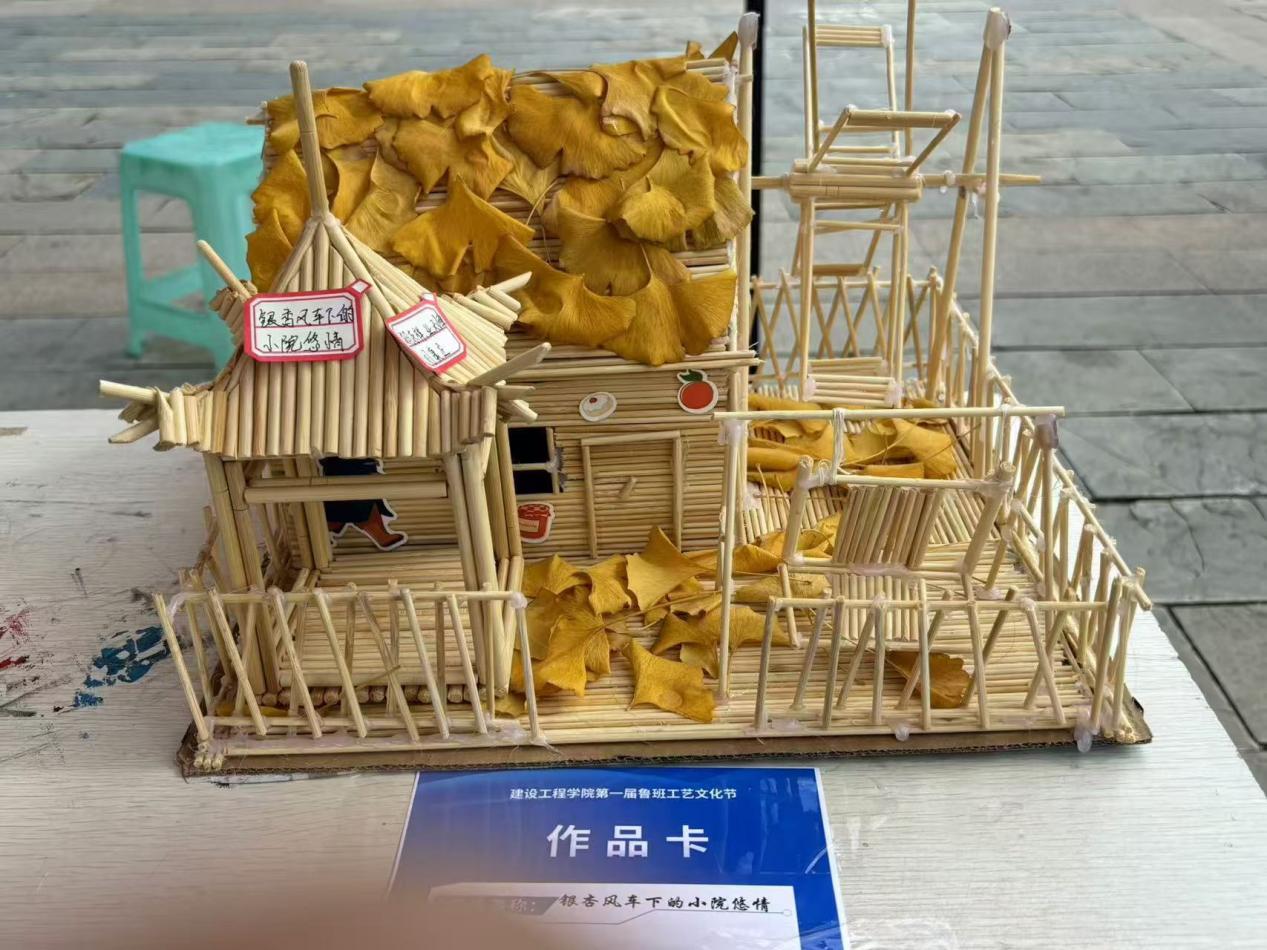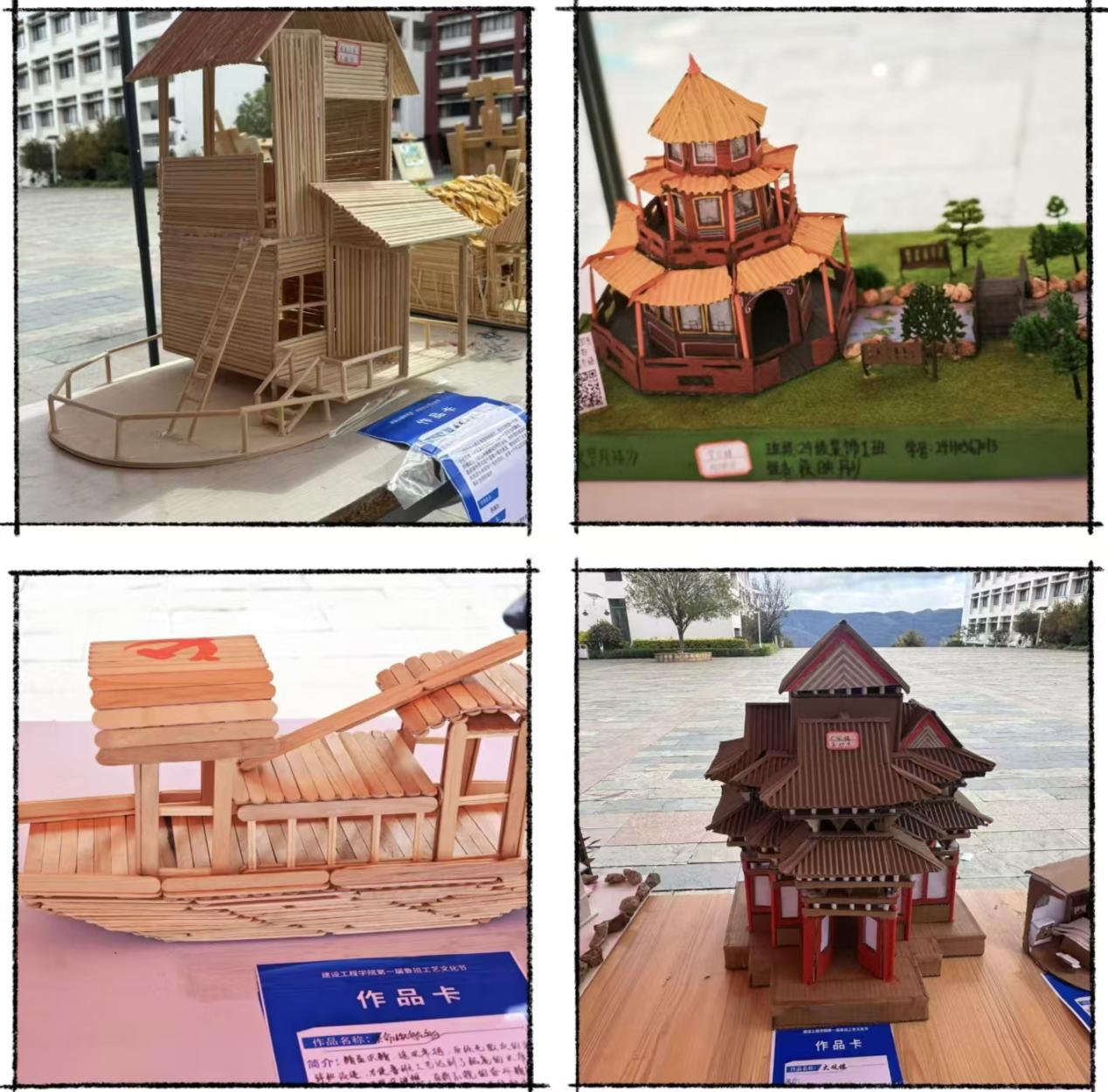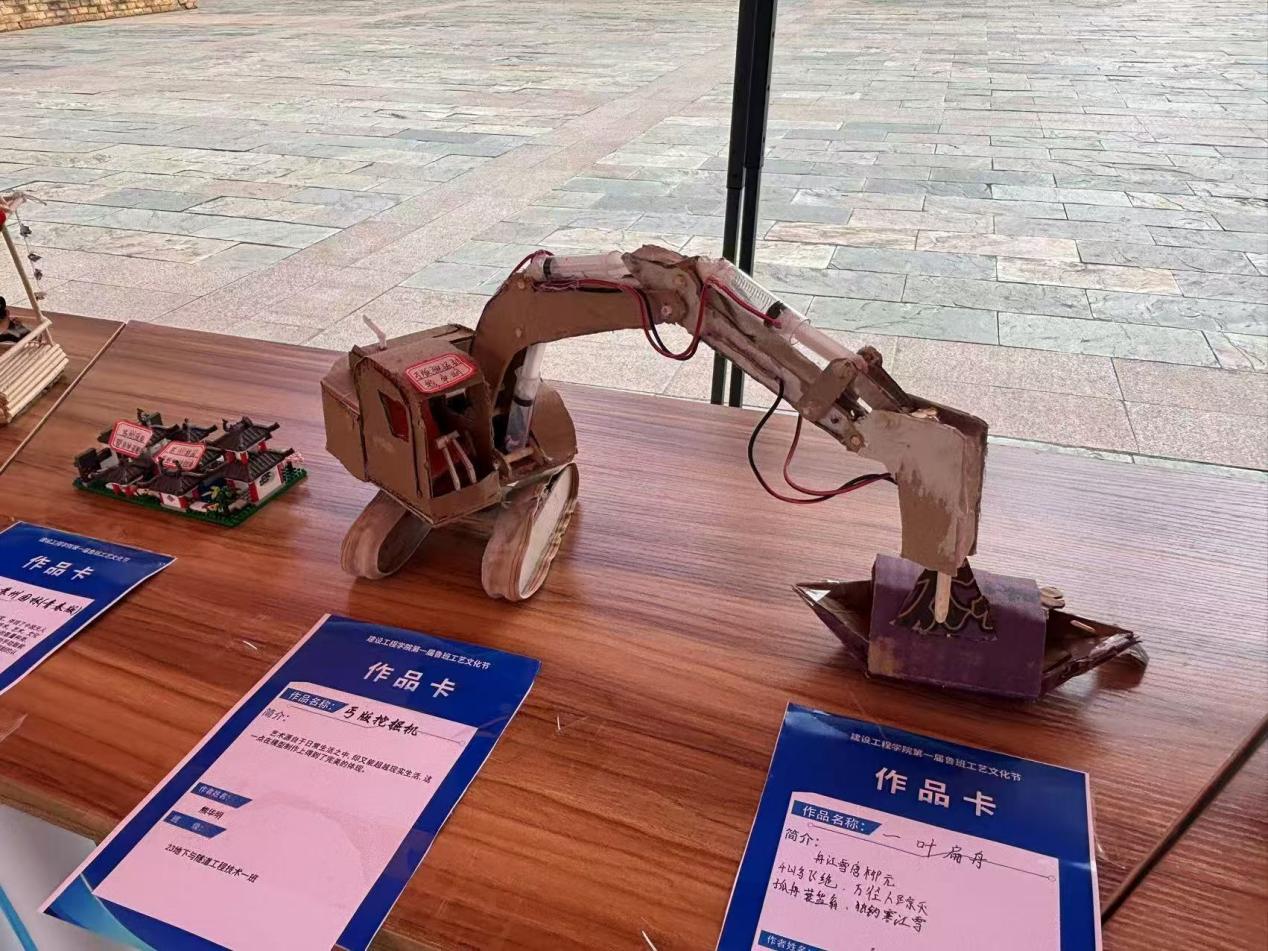本次鲁班工艺文化节共展出了100余件由建工学院学子亲手制作的手工艺品和绘画作品,主要包括抬梁式木构架模型、四角攒尖亭、砂岩花瓶、砂岩笔筒、挖机模型、大观楼等,这些作品以精美、细致的工艺展现出鲁班文化的独特魅力。学生们通过实践操作,不仅锻炼了自己的动手能力,也深入学习了解了鲁班文化中蕴含的工匠精神和创新思维。