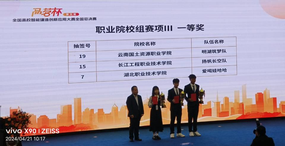 由冷雨桐、肖羽彤、姜丽雯、杨安邦、朱荣兵组成的明湖筑梦队,参加赛项三数字化施工方案设计比赛并荣获全国一等奖。该组的指导老师为罗昌杰、朱磊。