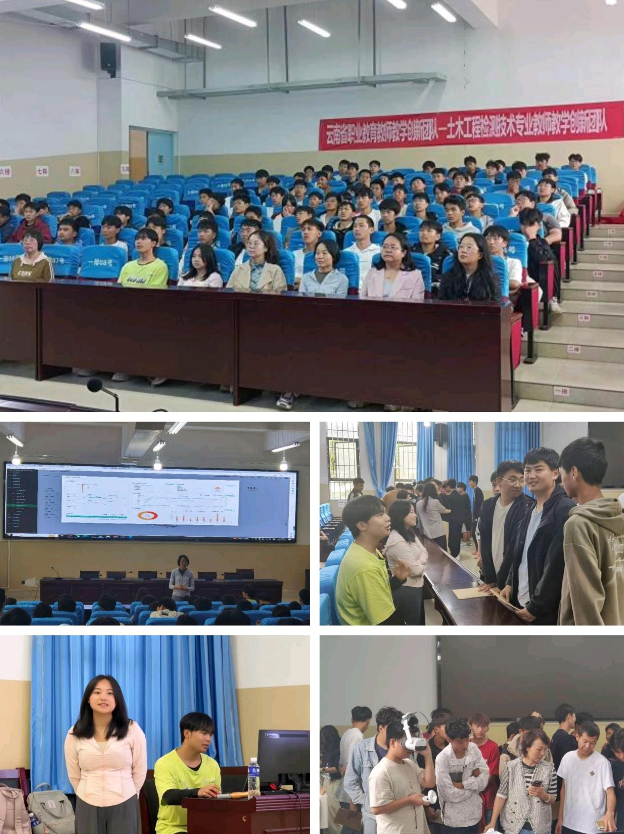 张凤婷老师讲解了BIM技术在建筑行业的应用,以云南国土资源职业学院的教学楼和图书馆建筑为例,给学生演示了BIM模型。左婷老师介绍了施工现场数字化施工的应用前沿,并给学生展示了今年taptap点点学生参加第五届全国高校智能建造创新应用大赛总决赛数字化施工方案设计荣获一等奖的学生作品。王绮滢老师还原了生动的课堂,带给学生钢筋平法专业基础知识,并应用钢筋平法识图教学软件将学生难以理解的结构施工图以直观、立体的钢筋信息模型展现出来,并以在校学生做的建筑信息模型为例,展示了建筑信息技术在工程计量计价中的应用。另外,品茗科技股份有限公司工作人员给学生介绍了智慧工地、绿色工地。