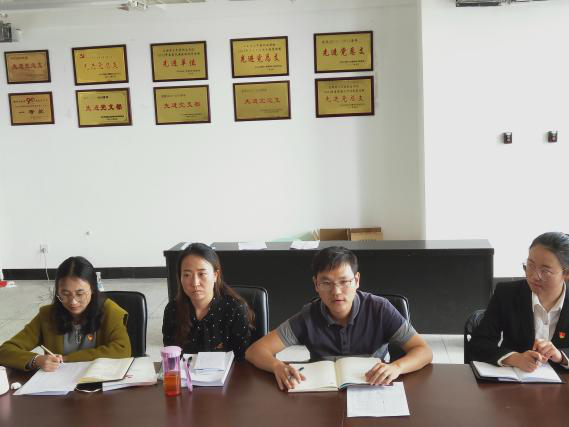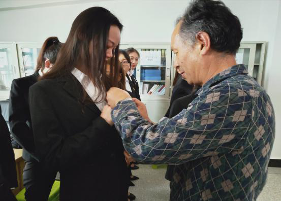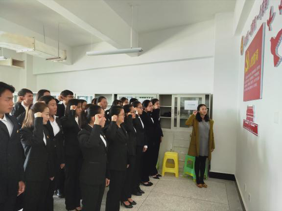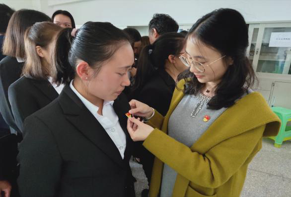 随后,支部书记张宁同志做了总结发言。她强调了在以后的学习生活中,各位党员应该在方方面面起到带头作用,时刻与党组织保持联系,努力学习好习近平总书记系列重要讲话,十九大精神及新党章的内容。现场,支部党员教师为二十一名预备党员佩戴党员徽章,并在党支部书记张宁同志的带领下,面对党旗进行宣誓,正式接收成为支部新预备党员。最后,校党委组织部陈瑞平同志来到会场,与新党员进行入党谈话。至此,接收预备党支部党员大会结束圆满结束。