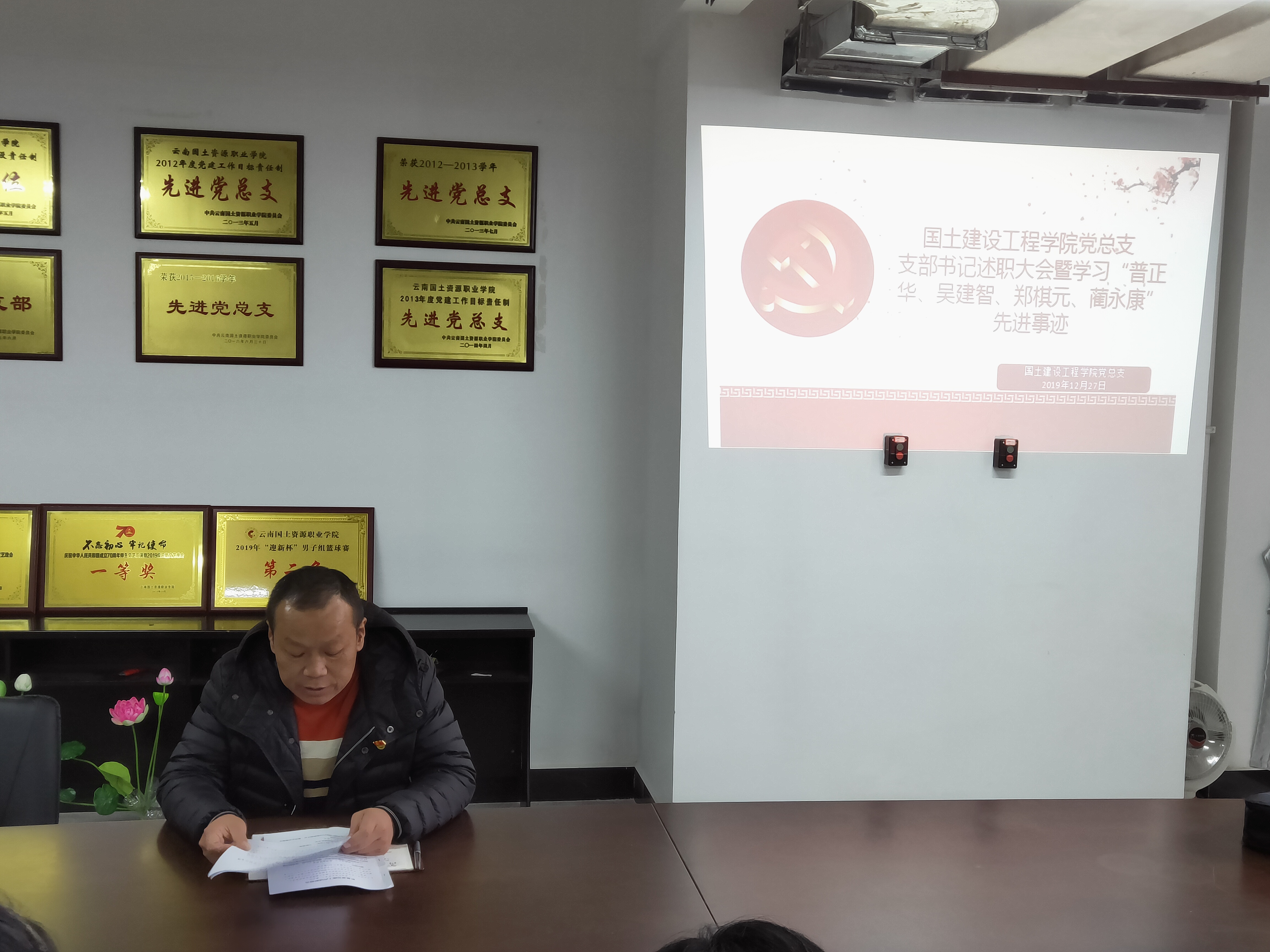 12月27日中午明尚楼c301,国土taptap点点官方网站党总支组织召开支部书记述职会。建工学院全体党员和非党员教师共34人参会,会议由党总支书记高昆同志主持,工程管理党支部书记张宁同志、工程造价党支部书记廖术龙同志、后勤党支部书记王春莲同志分别就2019年抓支部党建工作情况进行述职。