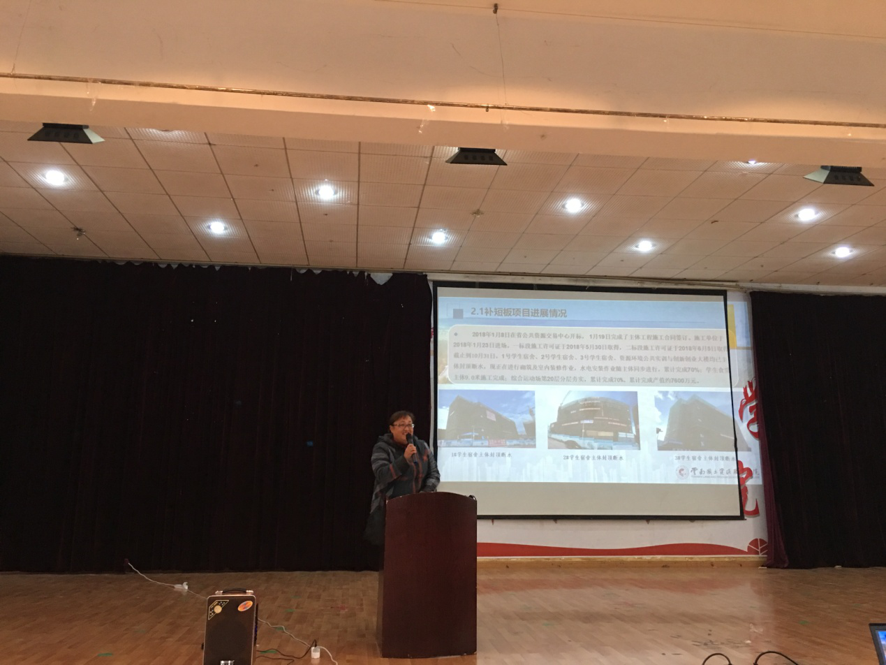 2018年12月29日中午11点,在经开区报告厅3楼,国土taptap点点官方网站利用学生期末考试空隙特别邀请云南国土资源职业学院副院长寸建平老师,后勤基建处处长王春莲老师对taptap点点2018级学生延迟进驻阳宗校区的原因召开了说明会。参加说明会的还有经开区管委会常务副主任李翠珍老师,国土taptap点点官方网站院长彭明兴老师,党总支书记高昆老师和辅导员张宁老师。