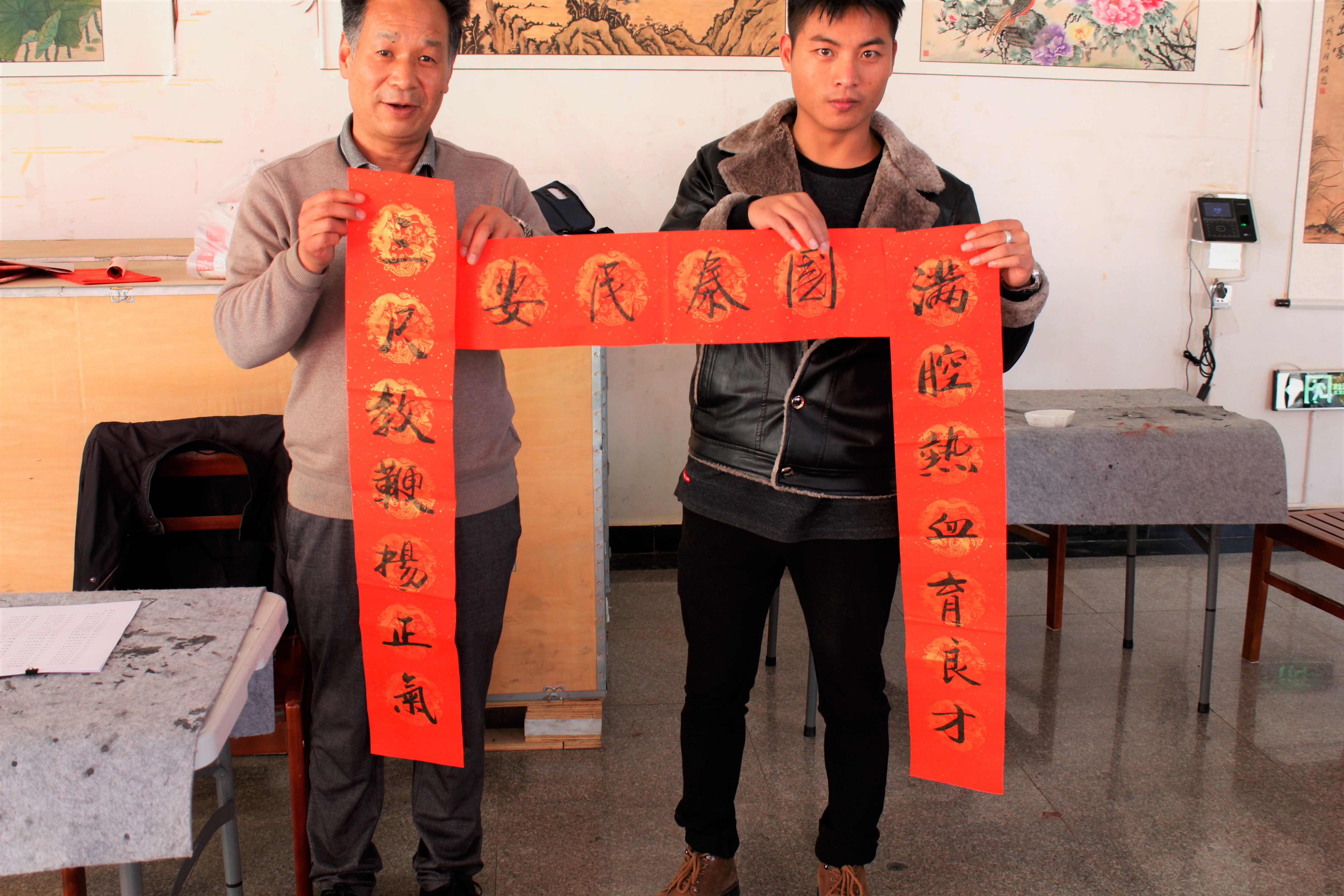 活动现场,谭老师、罗老师和夏雨书苑学生代表挥毫泼墨,一笔一画,笔力雄健,一幅幅喜庆大红春联不一会儿就展现在人们眼前。顿时,吸引了很多教师和同学驻足求联,“私人订制”对联,气氛红火,一副副带有新年气息的春联,一句句美好愿望的祝福,短短两小时内送出近百副春联和福字,当老师和同学们拿到充满新年祝福的春联时,纷纷表示感谢。让老师和同学们体会到书法的艺术美和中华传统民俗文化的魅力。