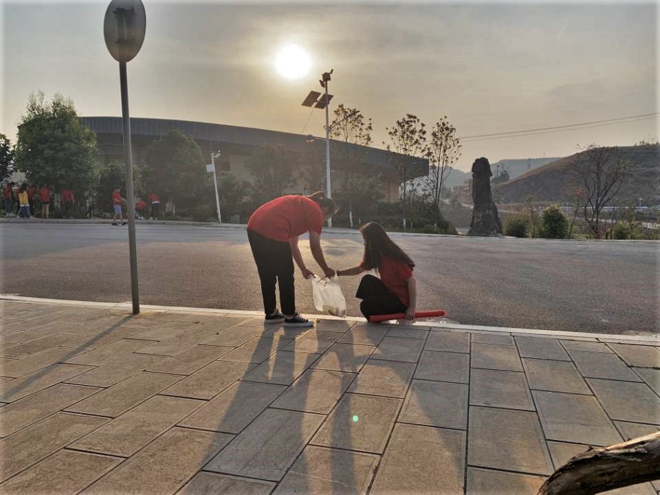 活动开始前,学生会干部提前到达国土广场,井然有序地进行签到,随后发放清扫工具和红色院服,杨老师告知学生干部活动过程中的注意事项。