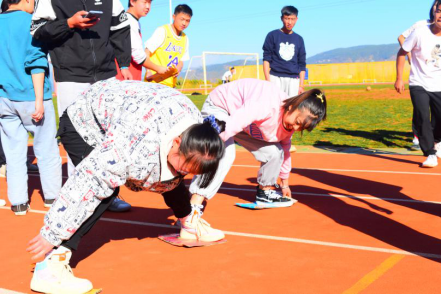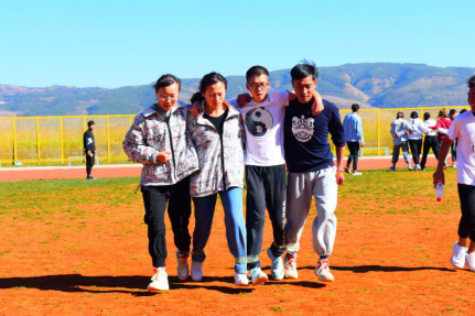 再次是考验默契的四人三足活动也十分精彩。顾名思义,四人三足是四个人用胶带将中间两位的同学的脚和两边同学的脚绑起来,四个人三足需要四个人团结一致用最短的时间走到足球场另一端即为胜利。四人三足首先需要平衡统一四个人的步调,还需要相互的默契。每一组同学都努力适应着每个人的速度,争取着队伍的荣誉。